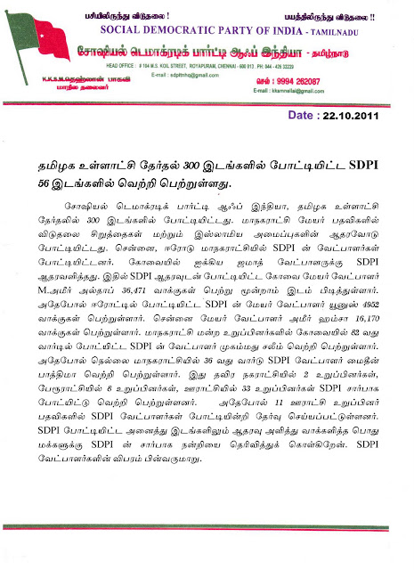 357 இடங்களில் போட்டியிட்ட SDPI 62 இடங்களில் வெற்றி .